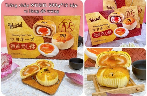 Đây là sản phẩm bánh trứng chảy nhân lòng đỏ trứng chảy hiệu Weisiel, có tên tiếng Anh là "Flowing Heart Crisp". Bánh có vị mayonnaise, mỗi hộp nặng 300g.
